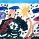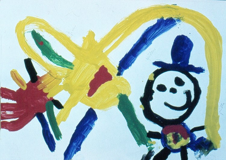 Vet aquí una mostra del domini del pinzell: quan ha dibuixat el “senyor” de la part esquerre, amb el seu barret, vestit amb dues peces,utilitzant el blau i el negre primordialment, pren el pinzell groc, més ample, i comença amb un moviment ampli que quasi va de banda del paper i esclata en una figura difícil de definir: també sembla un”senyor”, però l’actitud i les taques desorienten una mica. Finalment, per equilibrar la figura de l’ esquerra, pinta un gran sol. És notable la perfecció del ritme i de l’ equilibri, que constitueixen una composició perfecta, encara que inconscient. Les dues grans ratlles blaves compensen les dues verdes, determinat una mena d’ aspa central; i el moviment de caiguda de la figura groga”cauria” visualment si no fos que la forma vermella del sol l’ empara i s’hi fon.