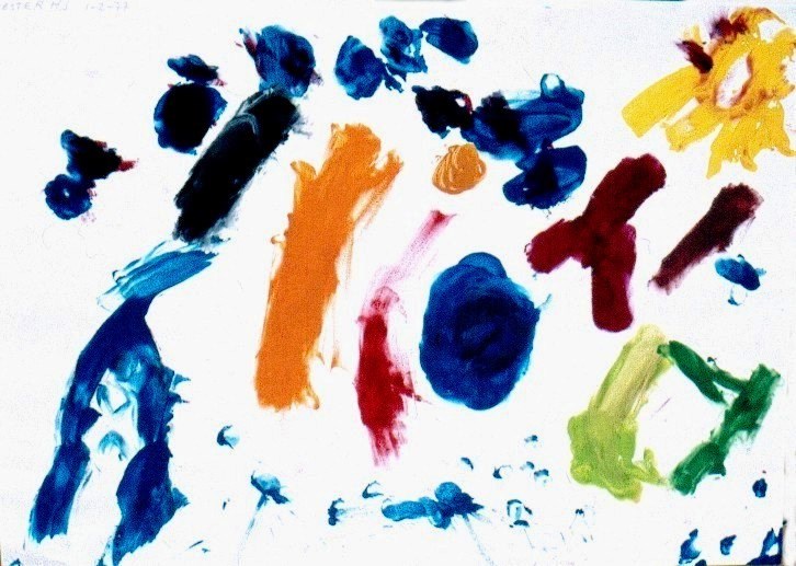 Malgrat que l’autora ha desenvolupat l’etapa que li correspon per la seva edat, en canviar de procediment experimenta una regressió: això és degut al fet que dóna més importància a la matèria, a l’emoció de tocar-la directament, sense l’ intermediari del pinzell, de manera que els sentiments i les emocions deixen en segon terme el fluir del pensament formal. Mentrestant, descobreix que no cal eixugar-se les mans cada cop que canvia de to, perquè arriba a descobrir que cada dit pot “ser” un color. D altra banda, és un senyal molt positiu el fet que empleni tota la superfície del paper.