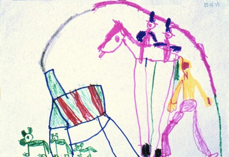 Un altre exemple de dinamisme i de sentit de la composició. El fum surt de la casa amb un gest decidit, dominant una forma que quasidetermina un arc que abasta el paper i que, a més, ha estat acolorida amb tres tons, sense perdre el continium de la trajectòtia. Així com els animals són representats d’ una forma estàtica, la figura humana, en canvi, es presenta dinàmica. Cavall, genets i el que sembla un home omplen-és a dir, donen significat- l’espai delimitat per aquesta gran obra. Es tracta d’ una nena que tenia imatges eidètiques: imaginava que la seva habitació era una gran quadra plena de cavalls, hi parlava, com si fos un fet real.