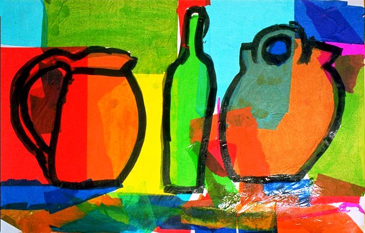 - Procediment: Collage Retolador negre de punta ample, paper de seda de diversos tons i vernís de laca.