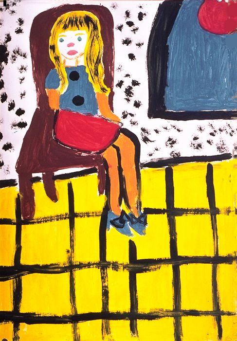 Es tracta d’una nena especialment dotada per a l’expressió visual. Es troba a l’etapa immediatament anterior a la descoberta de la perspectiva: només cal comparar la butaca –ben aconseguida- amb les rajoles, que ens mostren en un terra abatut sobre el pla vertical. Així com detalla les sabates i aconsegueix representar la posició de les cames, en trobar-se amb el problema de representació de les mans, el deixa solucionat molt aviat: les amaga al darrera. A la paret del fons, pigallada a cops de pinzell sec, expressa com li molesta no acabar de deixar plena tota la superfície del paper. Els colors estan ben harmonitzats: groc, vermell i blau distribuïts intuïtivament sobre el pla pictòric.