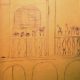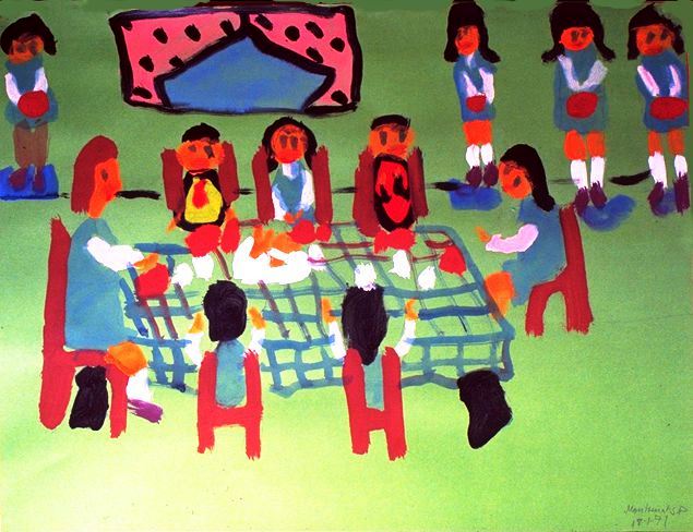 Pintat directament amb pinzell, sense l’esbós previ del llapis, podem observar-hi un clar domini mental de l’espai en el fet de la distribució de les formes. Inici de l’expressió perspectiva en el pla de la taula i les ratlles de les tovalles, tot i que es fa una mica d’embolic amb la pota esquerra de la taula, en representar-la darrere de la cadira de la persona gran que acompanya les escolars, tot i que sembla que hi ha dos nens (amb pitet o el jersei no uniformat?). Les nenes que estan dempeus, al costat de la paret, són nenes castigades; la de més a l’esquerra “vola” per sobre de la línia de terra (segurament, de primer va pintar les nenes i després, en traçar la separació entre el terra i la paret, es va adonar de la pífia i continuà l’horitzontal.
