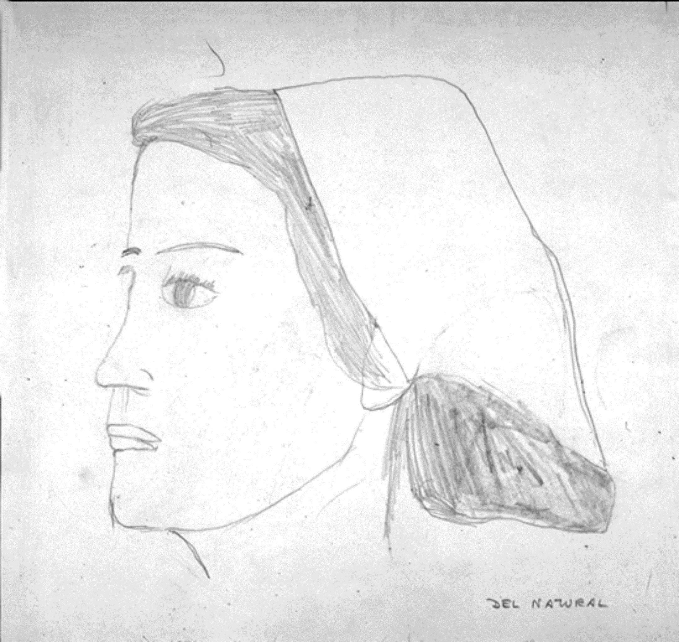 A diferència d’altres dibuixos anteriors, de seguida s’endevina que l’autora va preferir recórrer a un tipus de llapis més dur; altrament, els negres no li haurien quedat tan esblaimats i la línia, potser, li hauria resultat més sensibilitzada, malgrat la perfecció de les proporcions i de les formes en relació a l’edat.