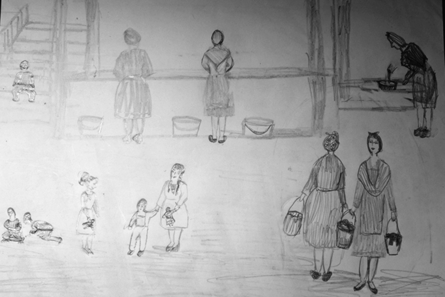 És de notar el domini del llapis, que ens mostra diversos valors de l’escala de grisos, la identificació amb els personatges, la riquesa d’experiències manifestades. Hi intervé un inici de perspectiva: les escales la diferència de magnitud de les persones segons la llunyania, l’amor per les criatures (quasi n’hi ha tantes com “senyores”)…